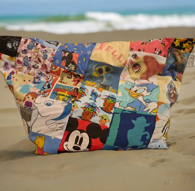 Big, bold, and full of character — literally! This large patchwork tote is made from leftover fabrics featuring everyone’s favourite characters, giving each bag its own playful personality. Fully lined for strength and finished with two reinforced handles, it’s perfect for shopping, beach days, or carrying all the essentials in style. A true feel-good bag — fun, functional, and fabulously eco-friendly! never 2 the same due to the nature of the fabrics and only aprox 5 bags available each year.